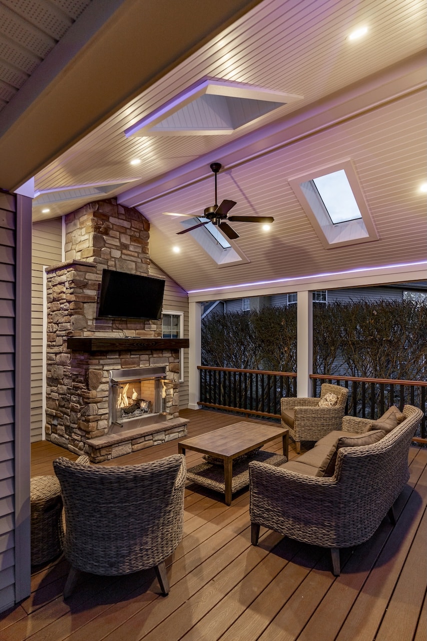 The major highlight is the completely reimagined rear deck. This stunning covered deck now features a beautiful structure designed for comfort in any season. The space is anchored by a majestic outdoor fireplace built with textured Eldorado Orchard Cypress Ridge Stone and equipped with a Stainless Steel Natural Gas Fireplace Insert—perfect for gathering friends and family and staying cozy on cool fall evenings. To ensure the space is bright and enjoyable during the day, the ceiling of the covered deck includes integrated Velux Sky Lights on both sides to let in ample natural light, complemented by a central fan to maintain comfortable air circulation.